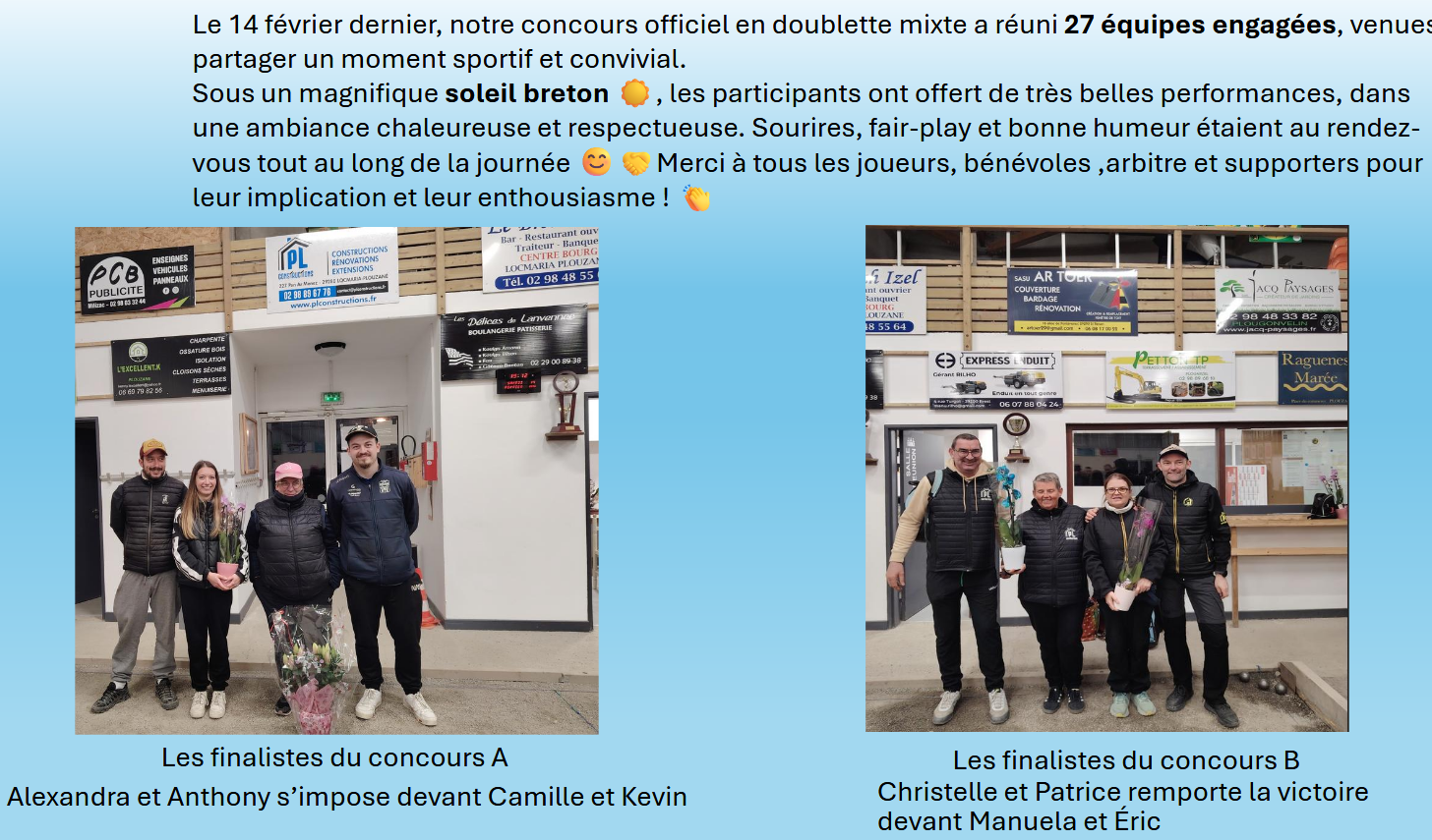 Le 14 février dernier, notre concours officiel en doublette mixte a réuni 27 équipes engagées, venues partager un moment sportif et convivial.
